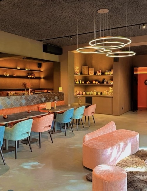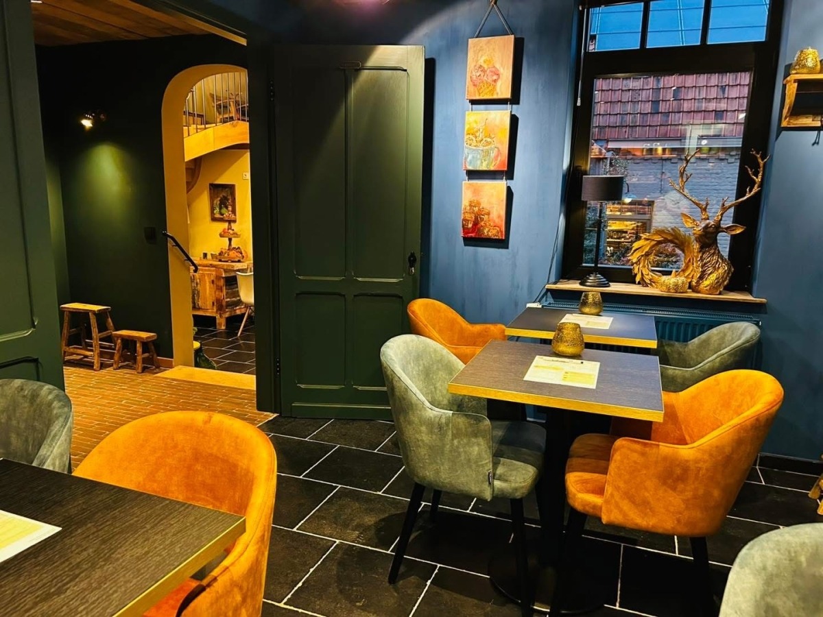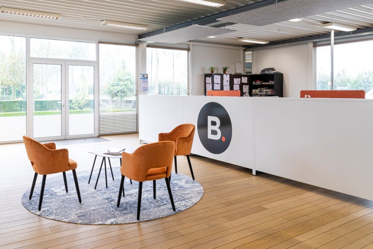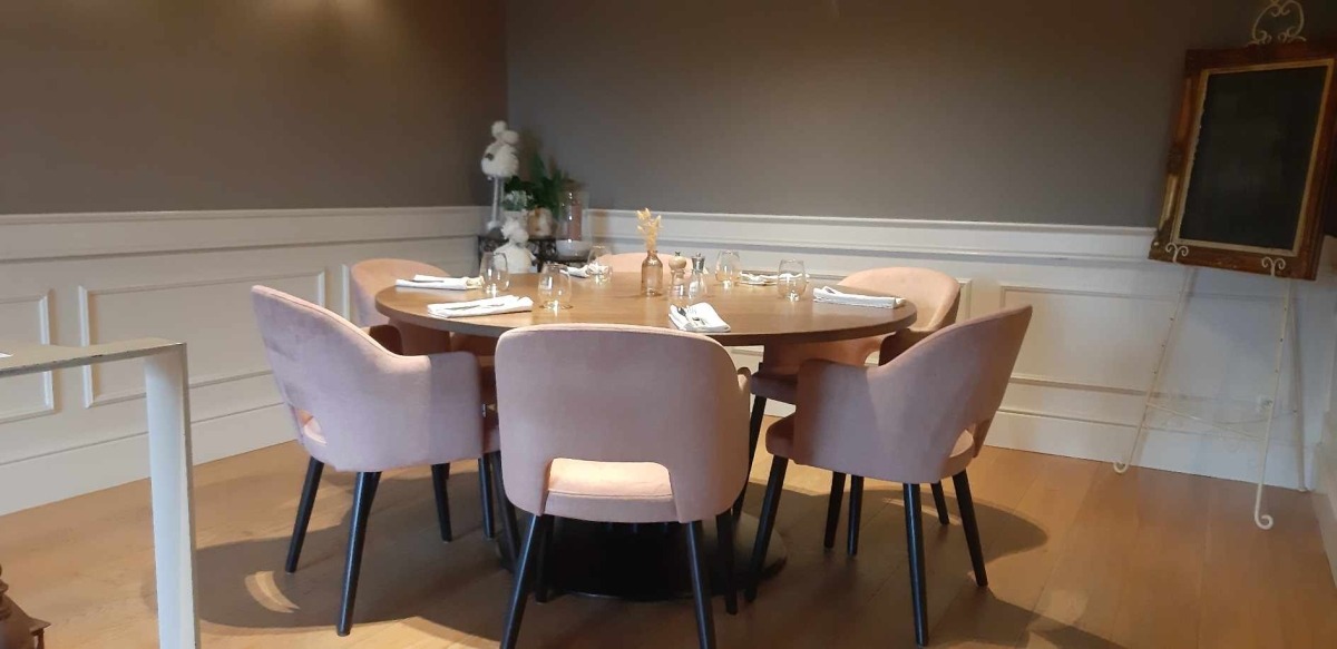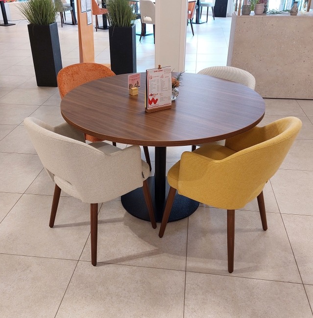 Armstoel met een confortabele gegarnierde kuip met een opening in de rug en ronde houten poten in beuk volgens de houtstinten.