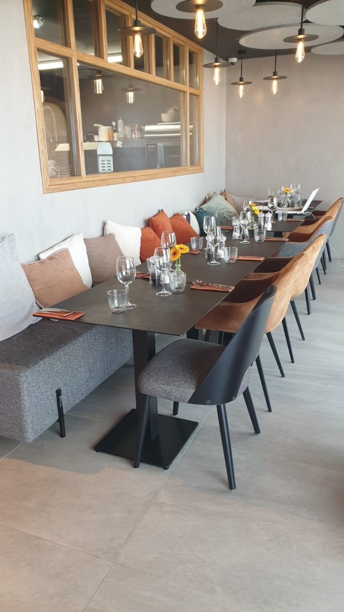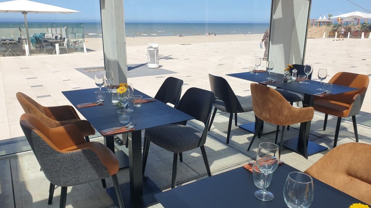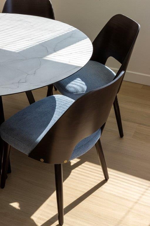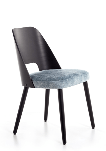 stoel met strakke houten kuip met een opening in de rug en ronde houten poten in beuk volgens de houtstinten.