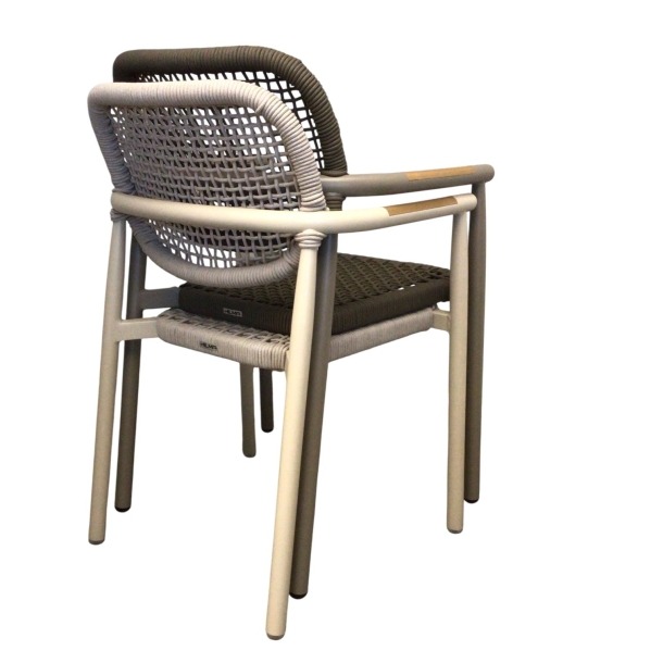 Terug naar overzicht previous item next item Nieuw Dublin mocha Beschrijving Terrasstoel met frame in kleur mocha zit en rug in pvc touw met armleggers in pvc teak wood stapelbaar afmeting 47 55 46 83